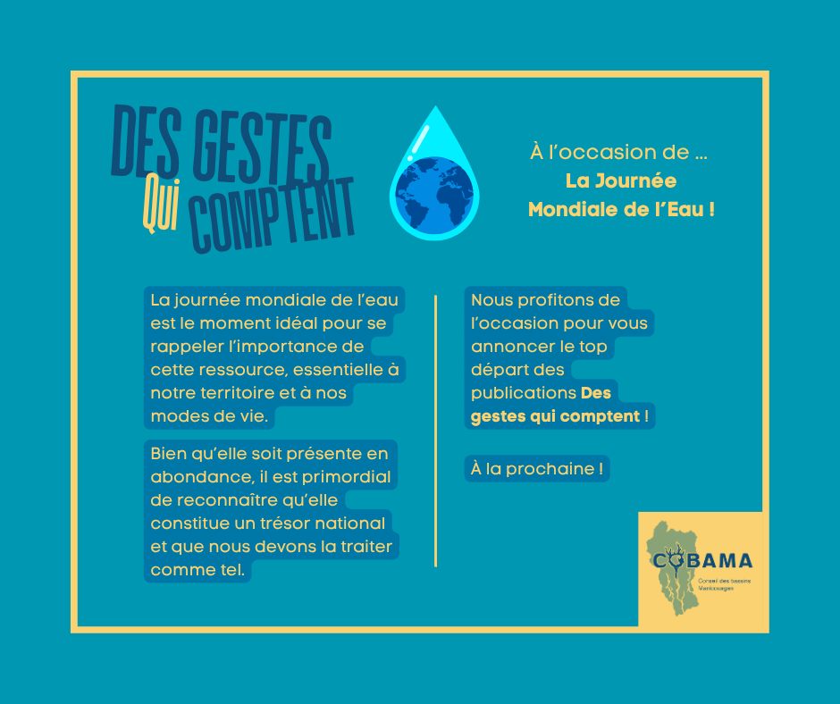 - Bonne Journée mondiale de l’eau 2026L’eau est une ressource précieuse dont l’avenir est incertain partout sur la planète, alors qu’encore aujourd’hui, des populations n’y ont toujours pas accès pour combler leurs besoins essentiels. Même dans notre région, certaines localités éprouvent des difficultés à approvisionner de façon durable et sécuritaire l’ensemble de leurs citoyen.ne.s. Profitons de cette Journée mondiale de l’eau… Lire la suite : Bonne Journée mondiale de l’eau 2026